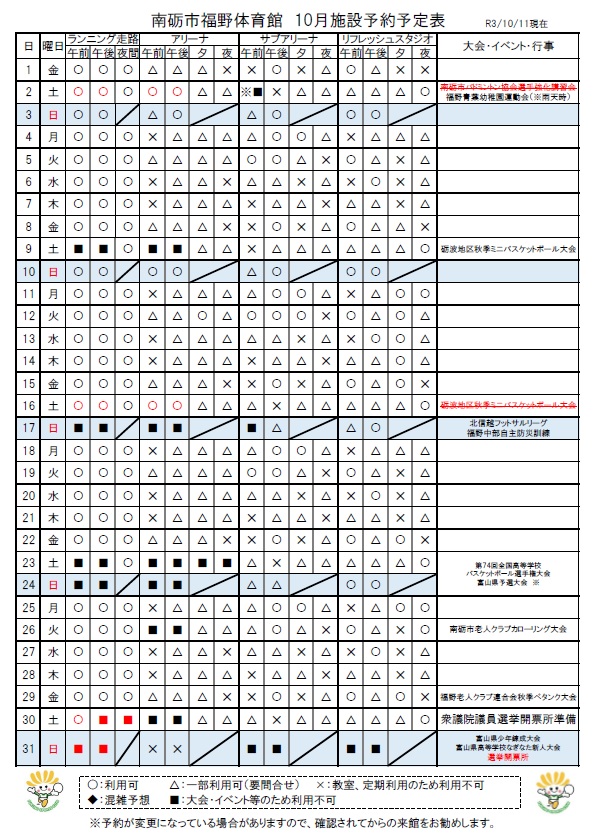 Home > INFORMATION > 施設使用状況予定変更について(2021年10月)