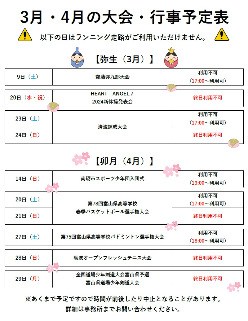 さて、3月と4月の大会、行事によるランニング走路の使用の状況についてご案内をさせていただきます。
