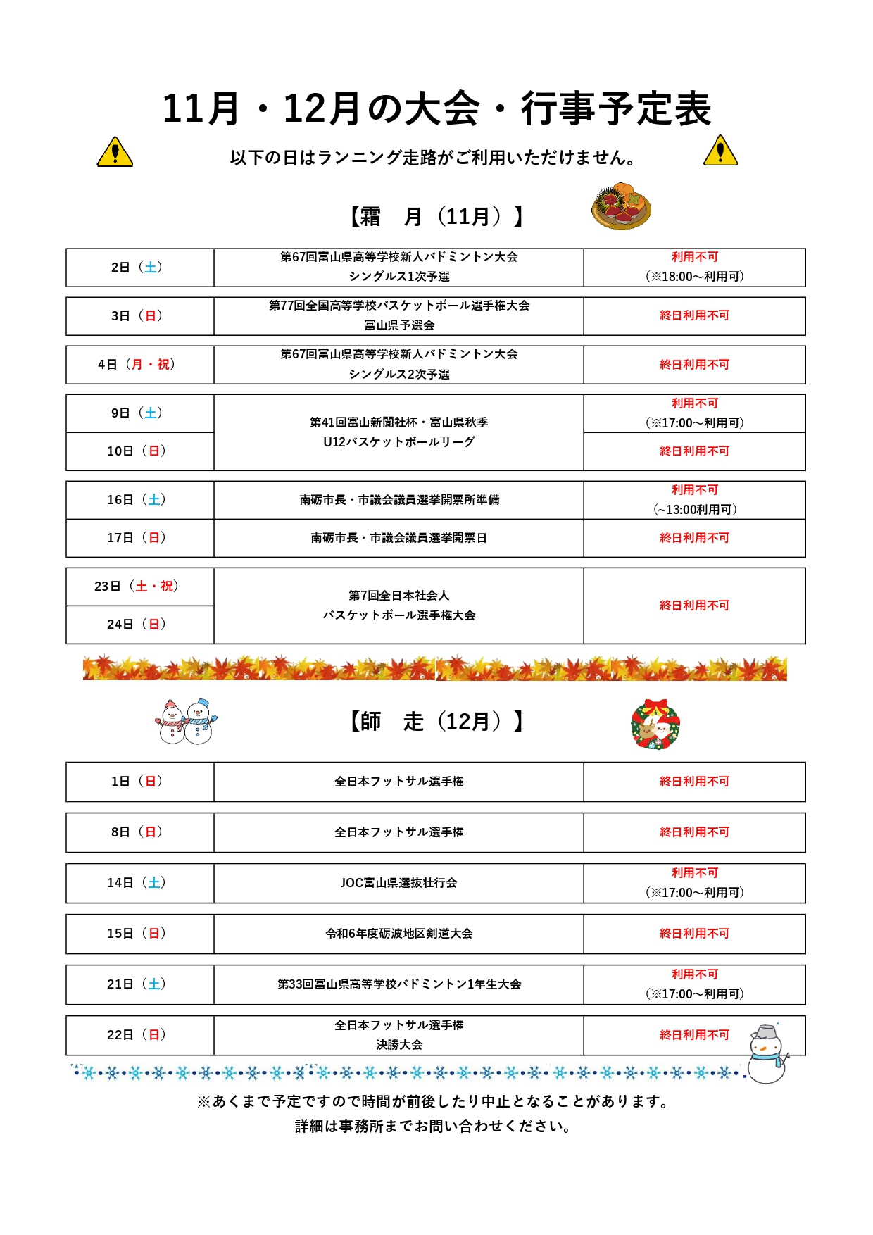 今月も大会・行事でランニング走路等使えない日がございますのでご確認ください。😢