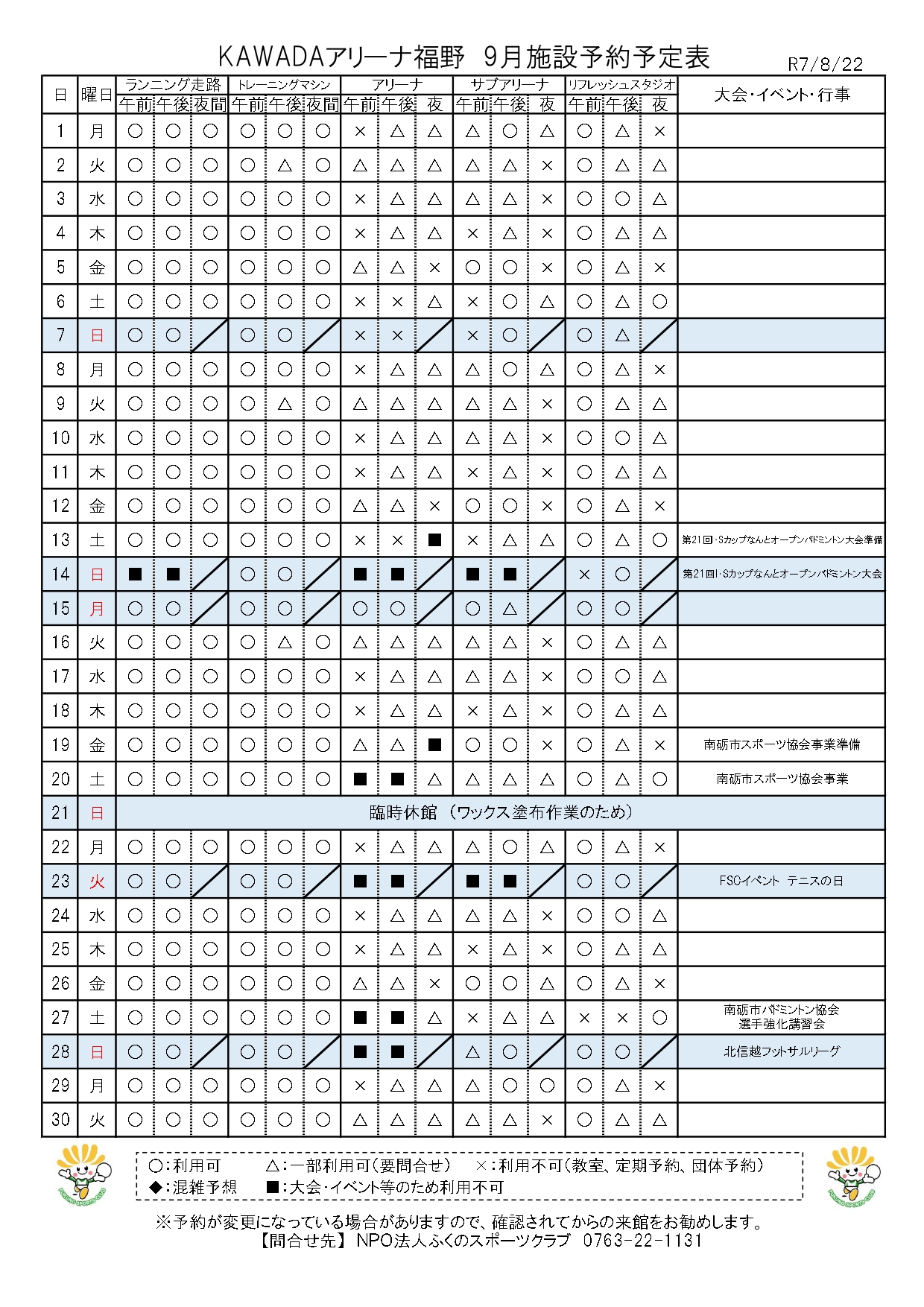 なお、9月21日(日)ですが、アリーナ等床面のワックス塗布作業が行われます。